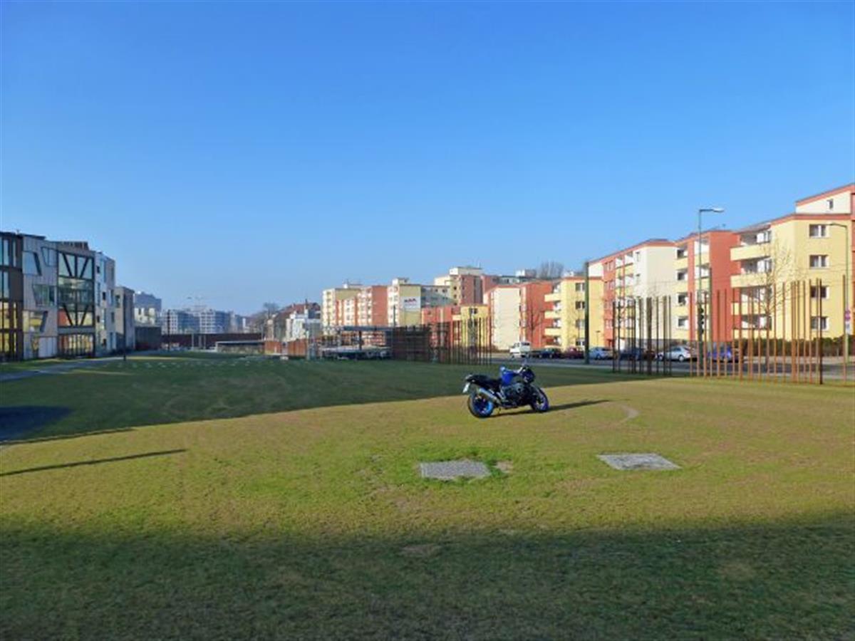 Pictures were taken at the Berlin Wall Memorial Bernauer Strasse. The rusty iron bars mark the course of the Berlin Wall. The green is the former death zone.